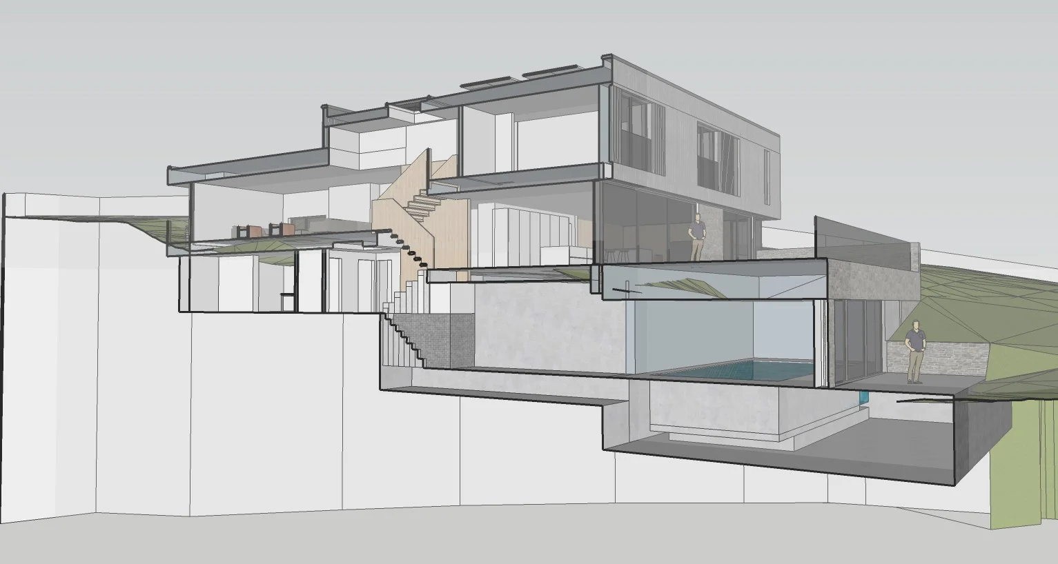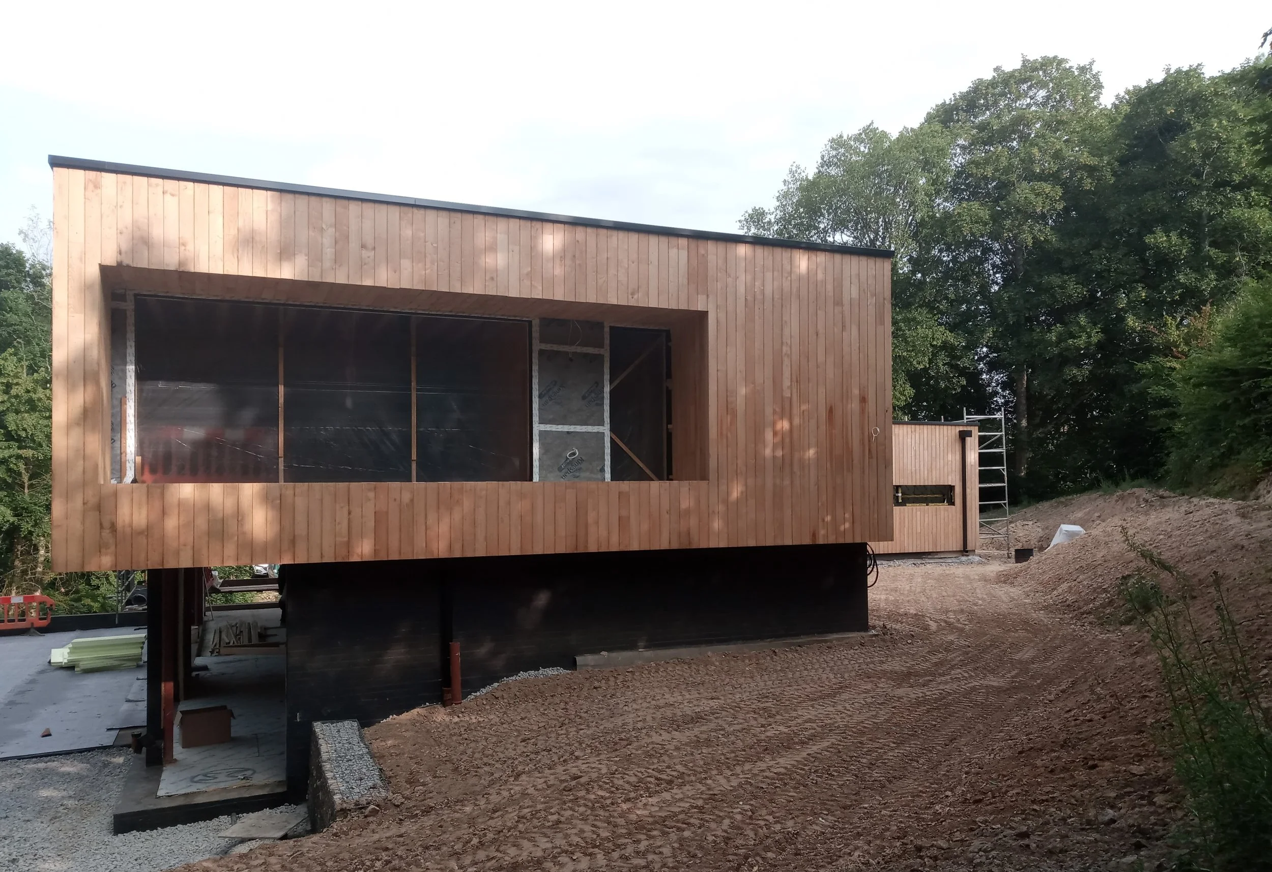 The project comprised the design and construction of a Structural Insulated Panel (SIPs) timber frame system for the above-ground external walls of the main dwelling, as well as for the pool house structure.