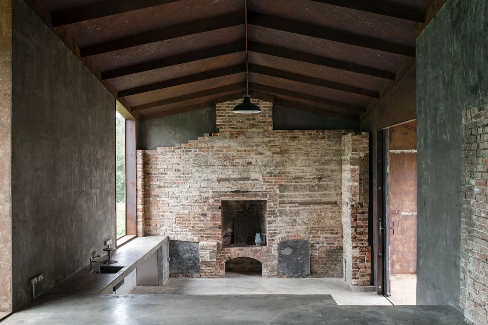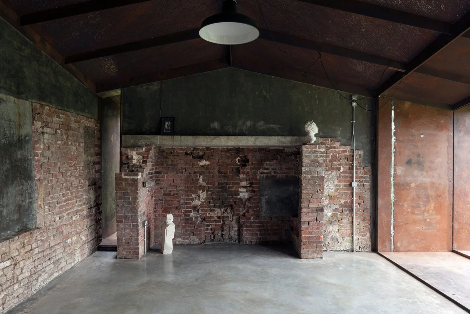 Artist's Studio to make sculptures. Existing brickwork was retained, and the figure of the original walls was completed inside and out in polished in situ concrete.