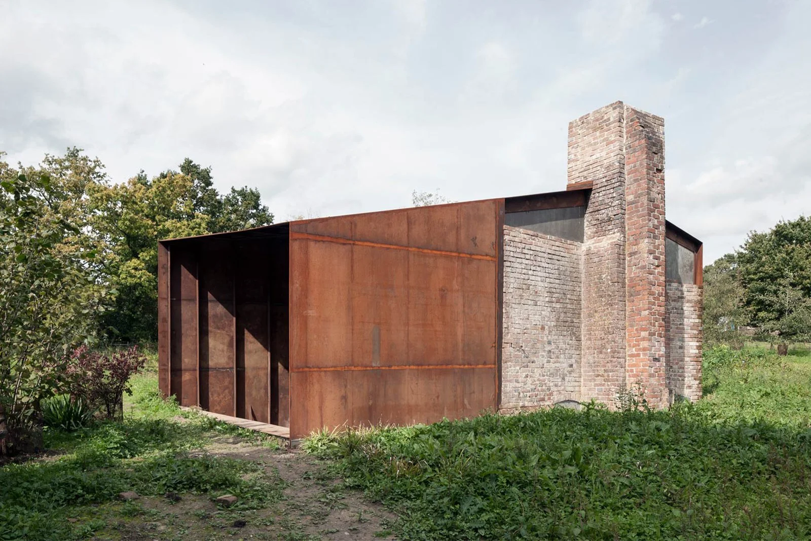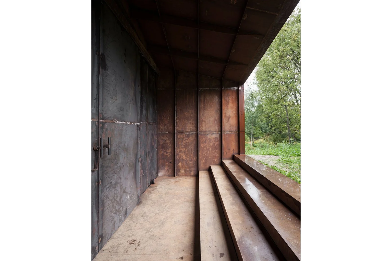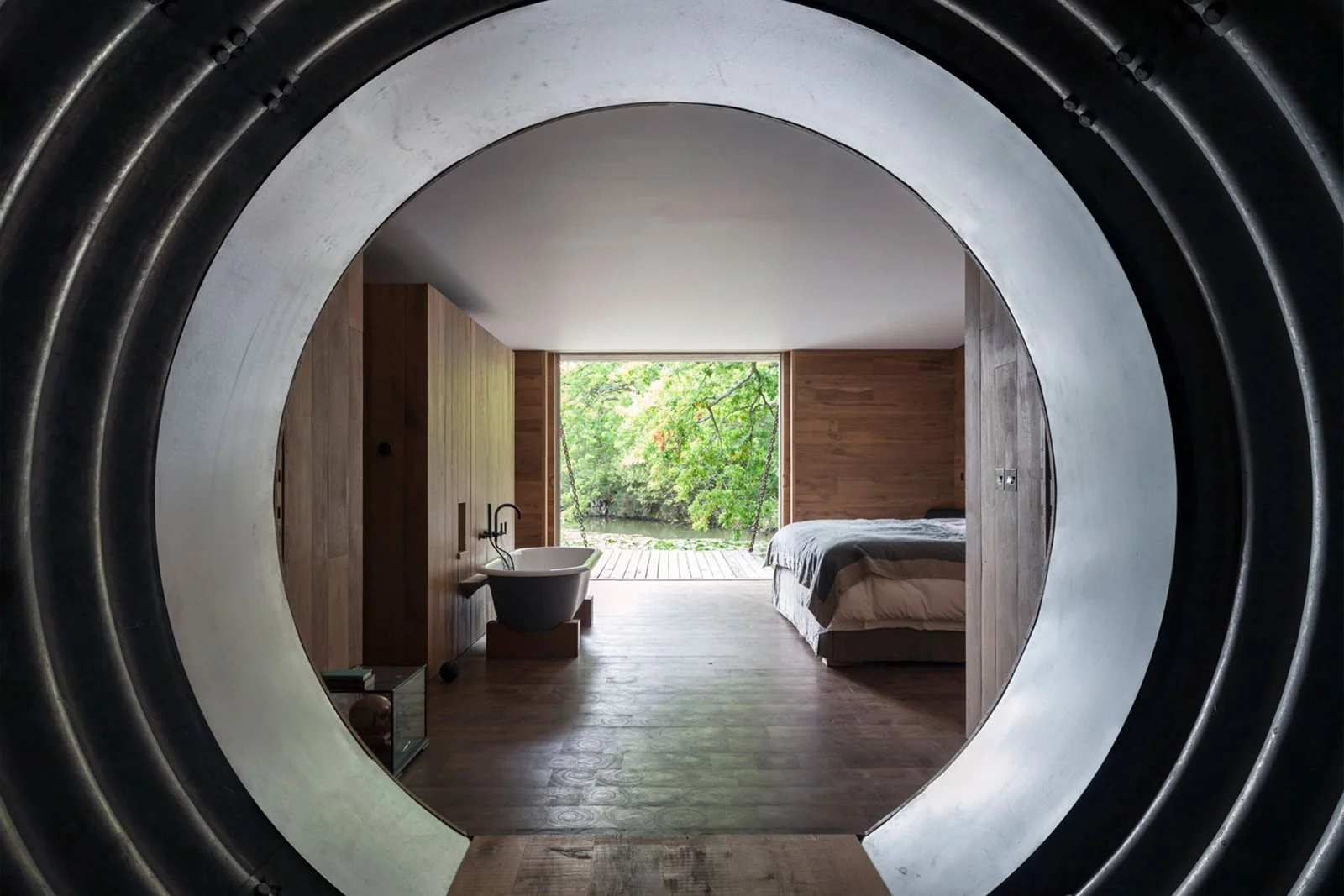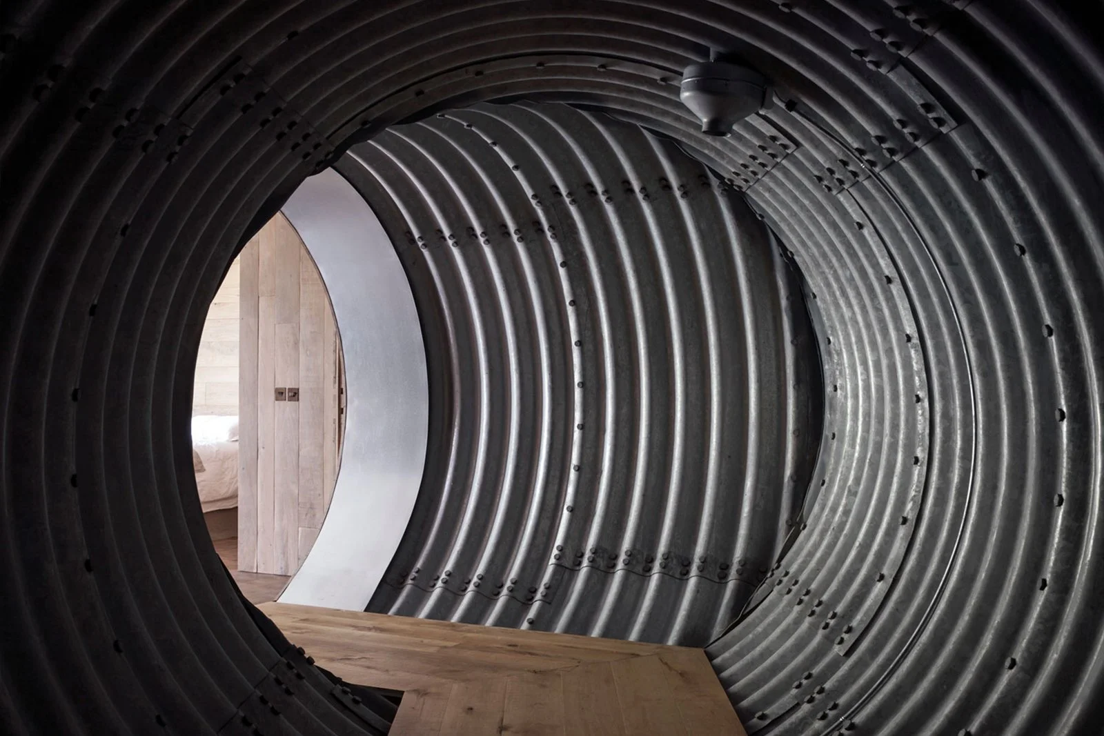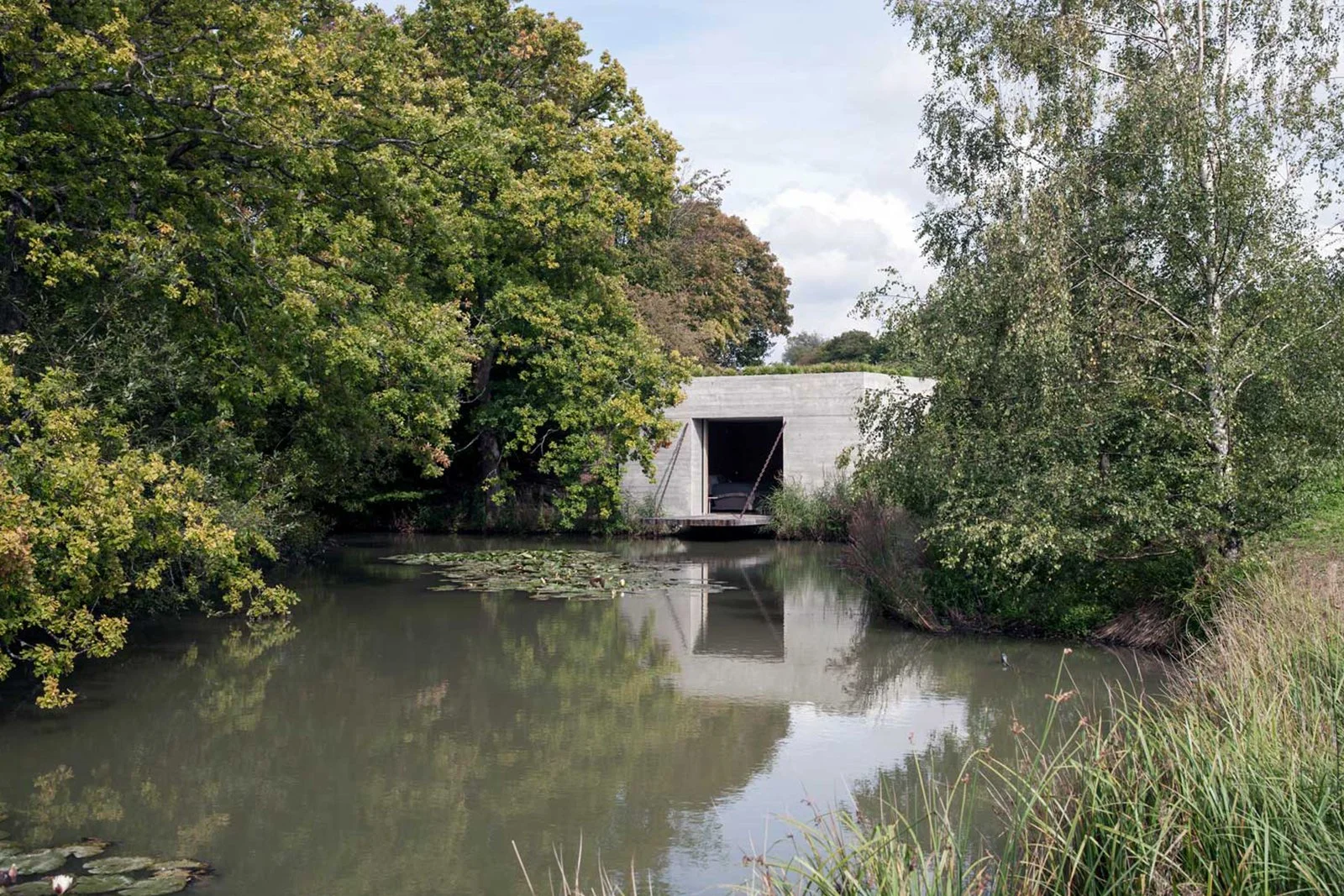 Self-contained guest suite containing a bedroom, bathroom, and a small kitchen. It is conceived as a singular, square, oak-lined room given orientation by a single large window overlooking a beautiful man-made lake and small island. The suite is only accessible from the existing house, via a 3m diameter, 40m long, galvanised-steel underground tunnel. An oak jetty is suspended over the lake.